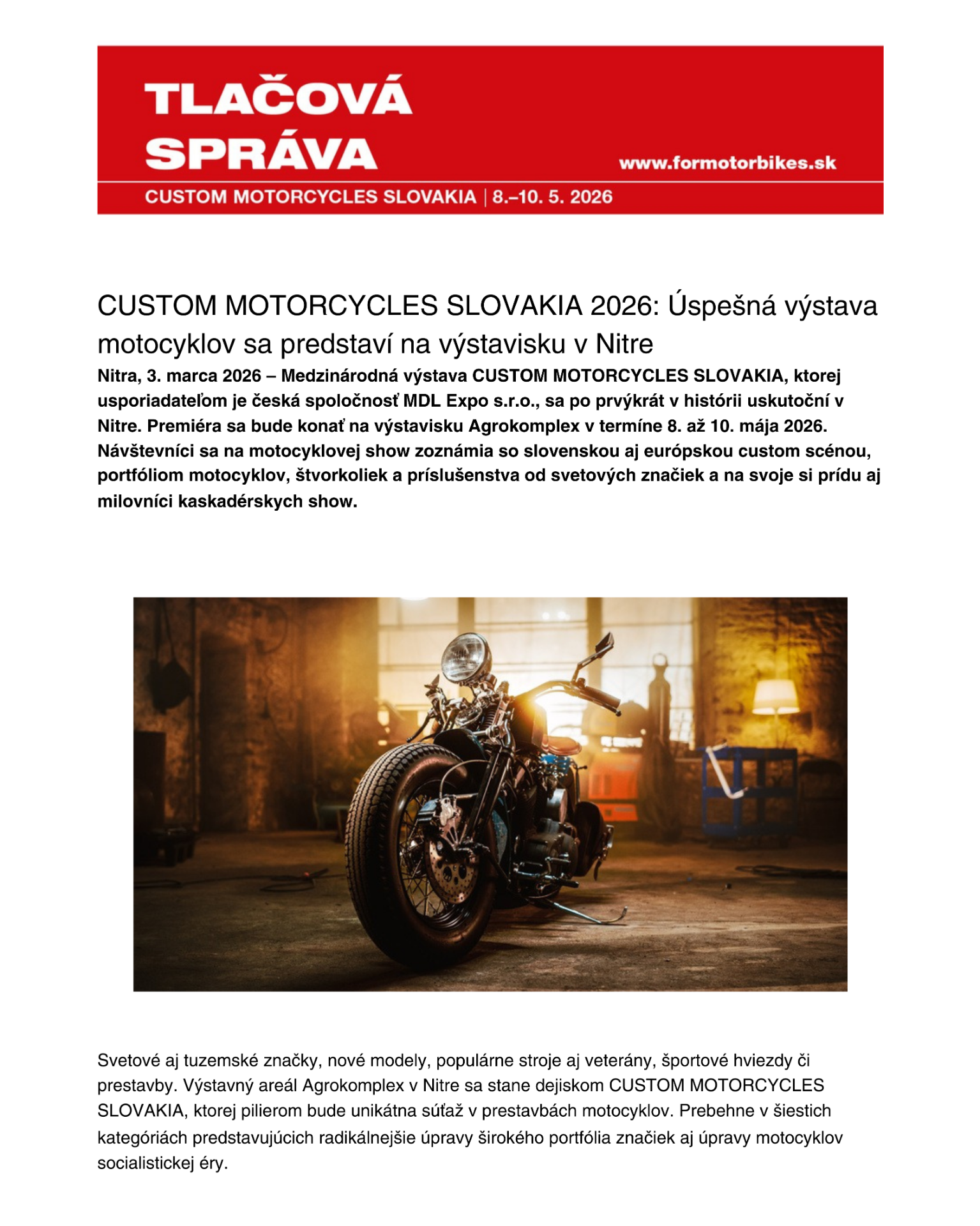 Na největší ploše, se spoustou novinek, s doprovodným programem, hvězdnými tvářemi a v unikátním souběhu s výstavou motocyklových staveb a přestaveb. To bude nová podoba tradiční motoristické výstavy MOTOCYKL PRAHA, která ve dnech 4. až 7. března 2025 zaplní haly výstaviště PVA EXPO PRAHA. Organizátor výstavy, společnost ABF, přinesla do Letňan unikátní akci, která opět rozšíří její veletržní portfolio v jarní sezóně 2027, vždy jednou za dva roky.