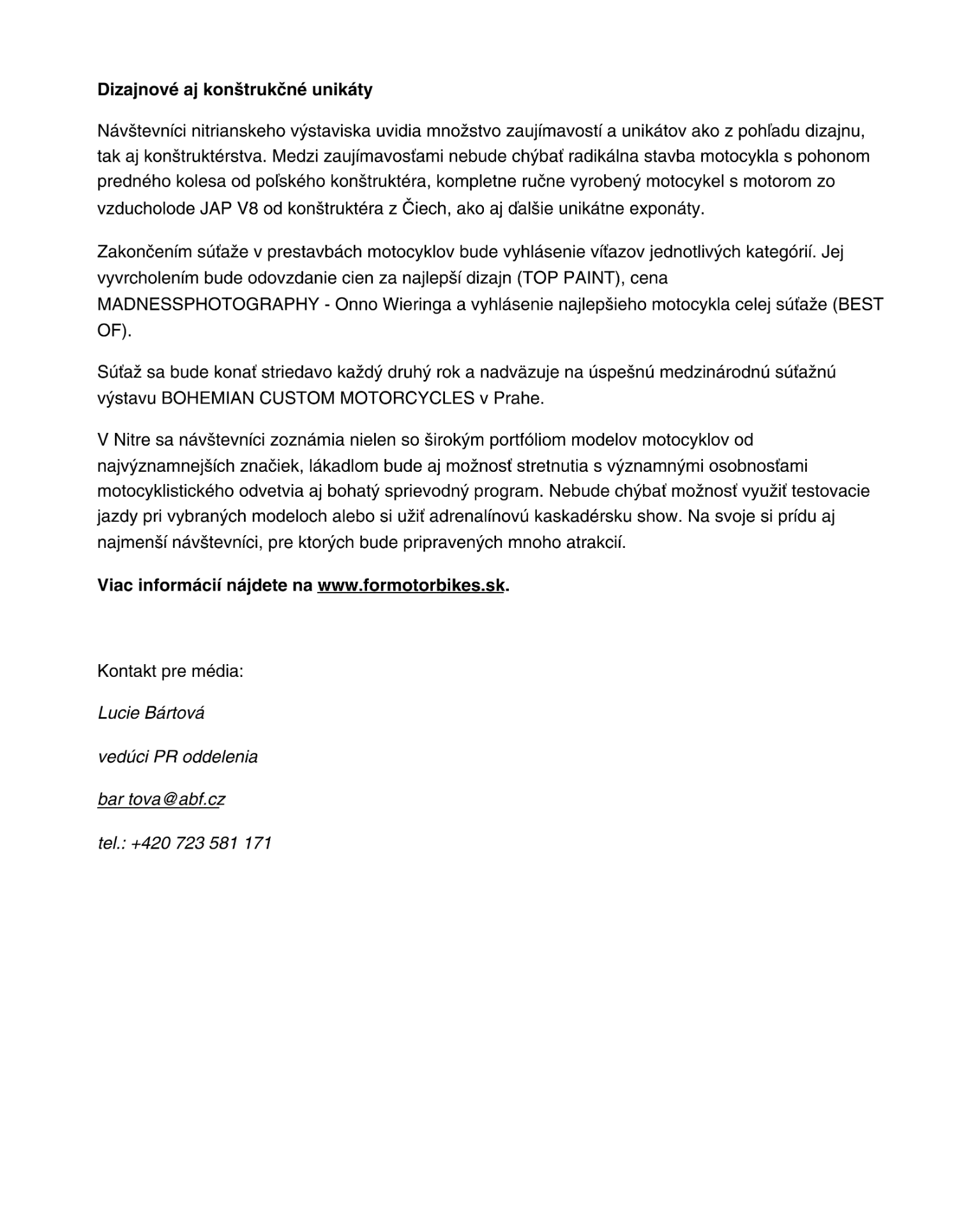 Součástí veletrhu bude mezinárodní soutěžní výstava expozic custom staveb a přestaveb - Bohemian Custom Motorcycles. Návštěvníci tak uvidí špičky stavitelů těchto upravených motocyklů nejen z ČR, ale i dalších evropských zemí.